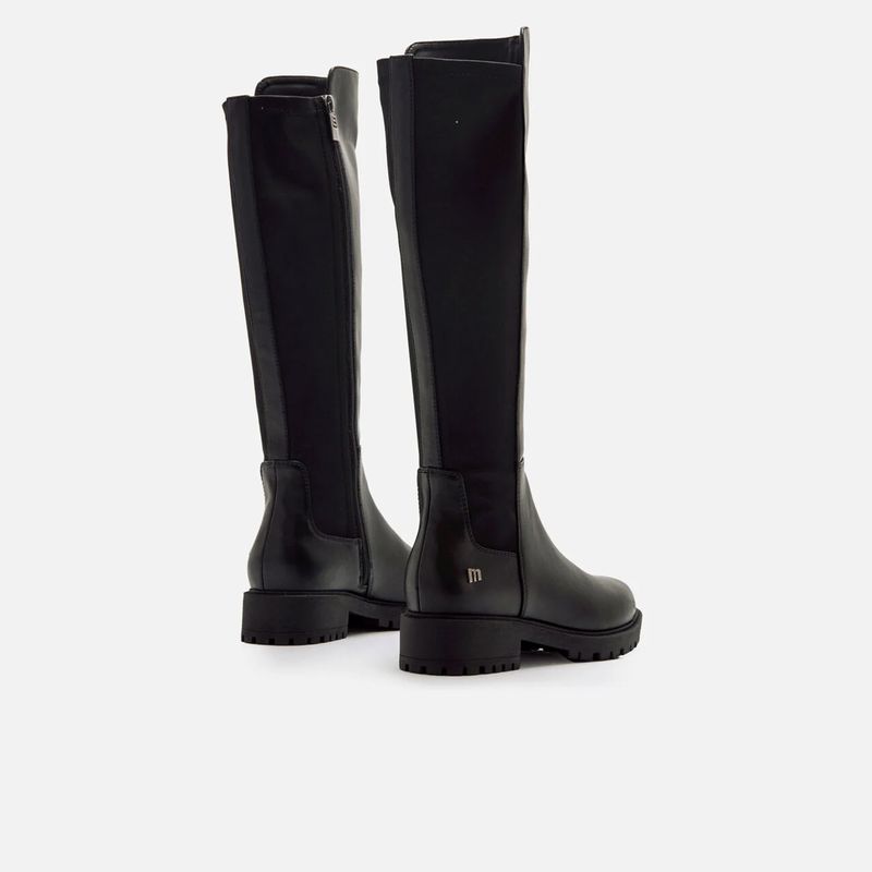 Bota alta Mustang Campa para mujer en color negro, un básico moderno pensado para el uso diario. Su caña elástica se adapta perfectamente a la pierna, mientras que la cremallera lateral facilita el calce y aporta practicidad. La suela dentada con tacón bajo garantiza una pisada cómoda y estable en cada paso. El detalle metálico del logo en el lateral añade un toque distintivo al diseño. Además, está fabricada con un 60 % de algodón reciclado postconsumo y un 40 % de algodón convencional, apostando por un estilo más sostenible.
